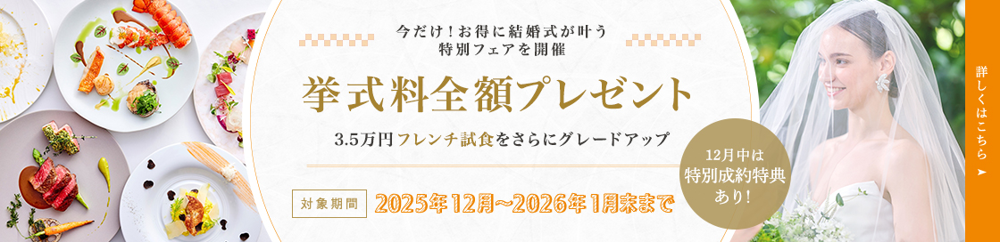 ◆2026年1月末までの期間限定◆挙式料全額OFF◆詳細はブライダルフェアでご相談ください