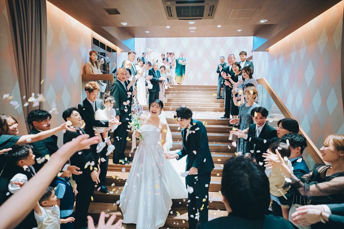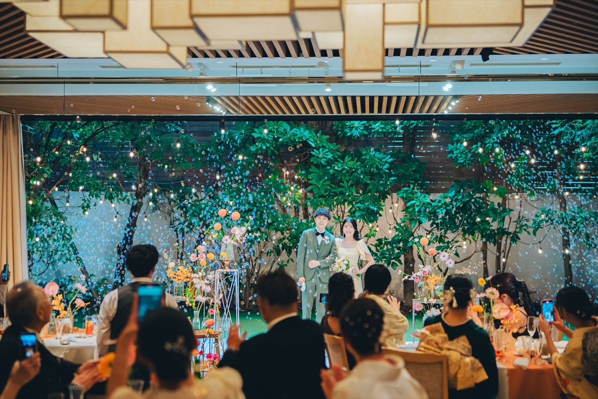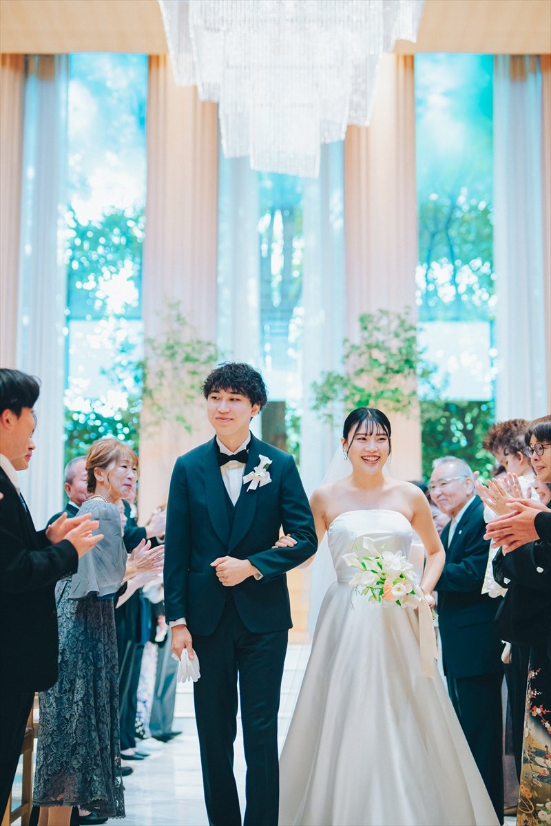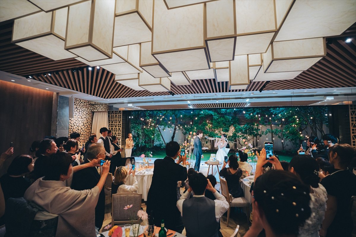 おふたりが選ばれたのは人前式。しょうやさんもみつきさんもご家族より最後の身支度を整えていただき、挙式が始まります。誓いの言葉は、それぞれ大事にしたい想いをお互いに誓い合っていただきました。ゲストの皆さまに待合室でご協力いただいた、マーブル模様のピースをはめた証明書を披露いただきました。晴れて夫婦になるおふたりへ沢山のゲストの皆さまより祝福をいただき、挙式はめでたく結びとなりました。