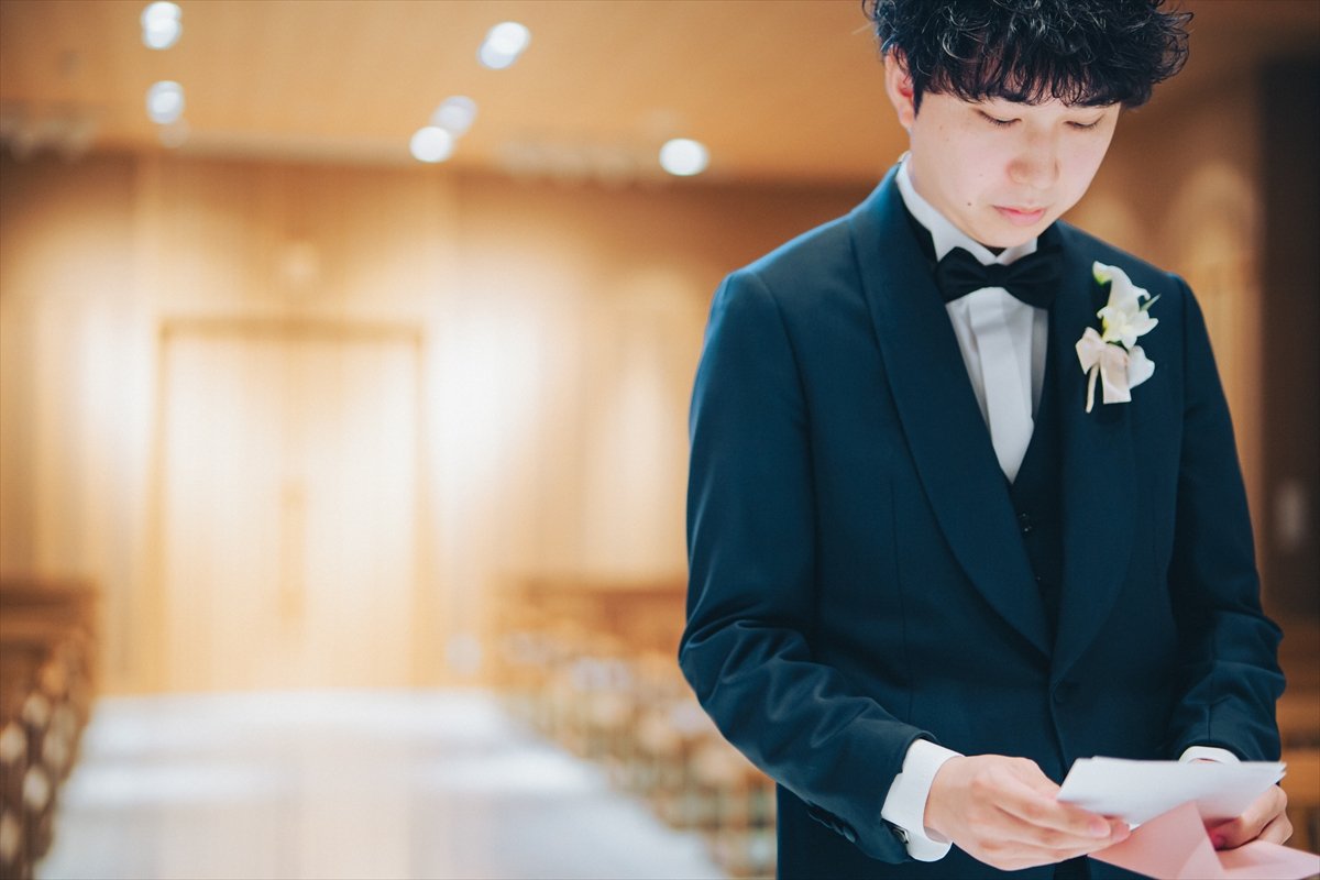 おふたりの一日はファーストミートからスタート。お互いの姿を見る前に、みつきさんからしょうやさんへサプライズのお手紙をご準備してくださいました。直接だと少し恥ずかしいから…と、手紙にして伝えたい想いを届けていただきました。緊張されていましたが、いつも通りのおふたりらしく笑顔いっぱいの温かい時間になりました。